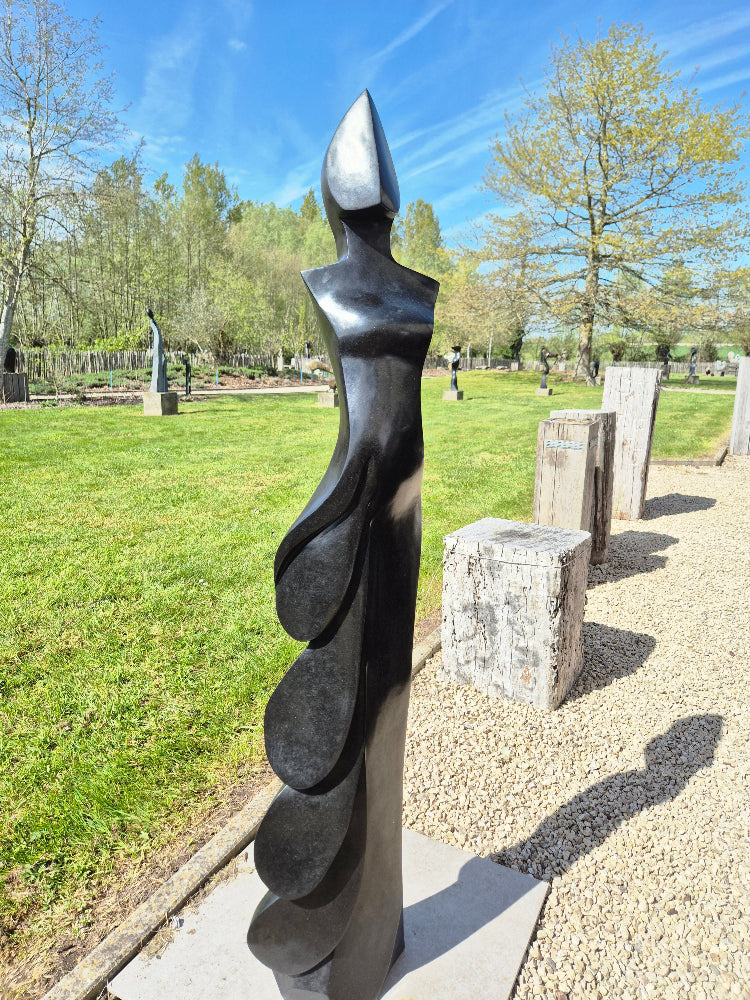Sierlijk, gestileerd, lang beeld, gebeeldhouwd door Stephen Murenza. Het beeld is volledig gepolijst. Dit beeld heeft een zeer elegante, opwaartse beweging—bijna alsof een figuur zich naar het licht toe ontvouwt. De gelaagde vormen suggereren beweging en groei. Het werk voelt zowel menselijk als spiritueel aan, eerder dan puur abstract.