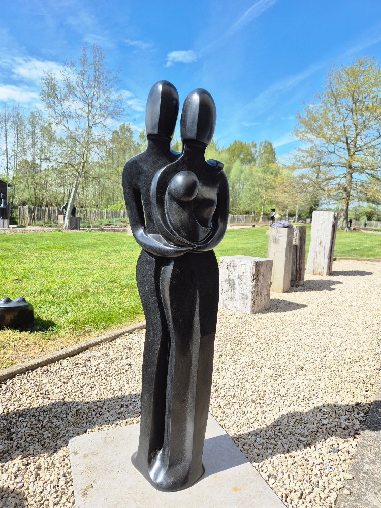 Ouders met hun pasgeboren kind. Het beeld is gemaakt in springstone, en vooraan volledig gepolijst. Achteraan zie je aan de haren nog een stuk van de oorspronkelijke steen.