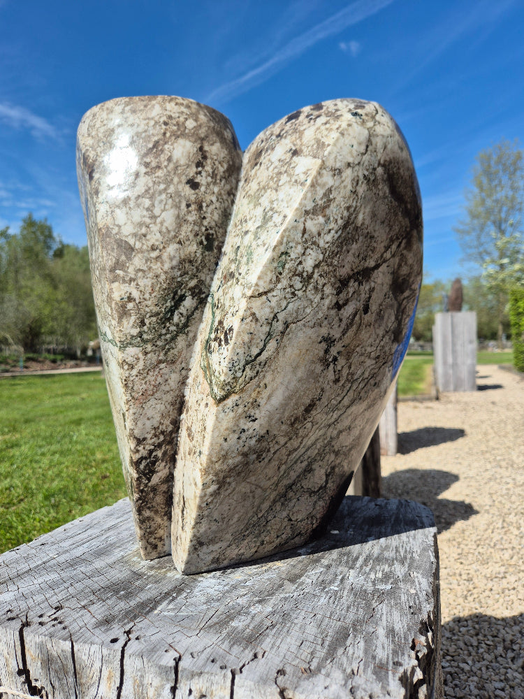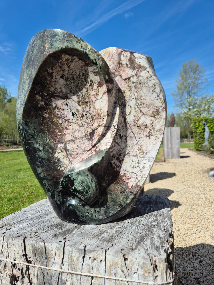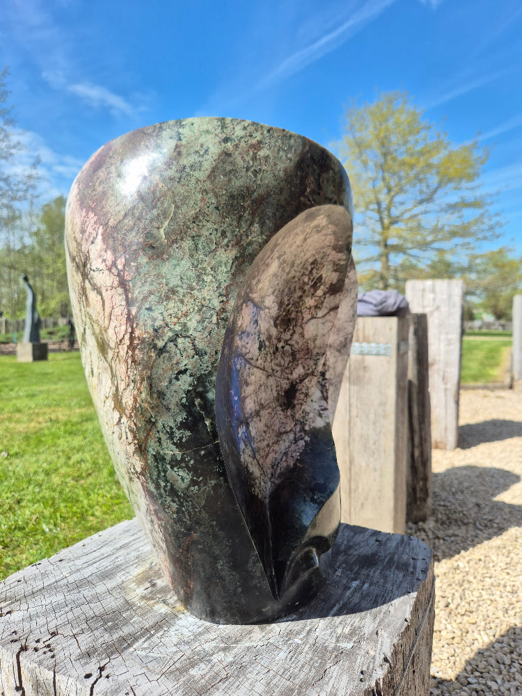 Dit beeld valt op door de schitterende kleurschakeringen in de steen. Het is een robuust beeld, en je zou er aan de ene kant een gezicht in kunnen herkennen. Voorzie zeker een stevige sokkel voor dit zware beeld.