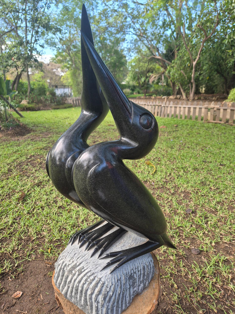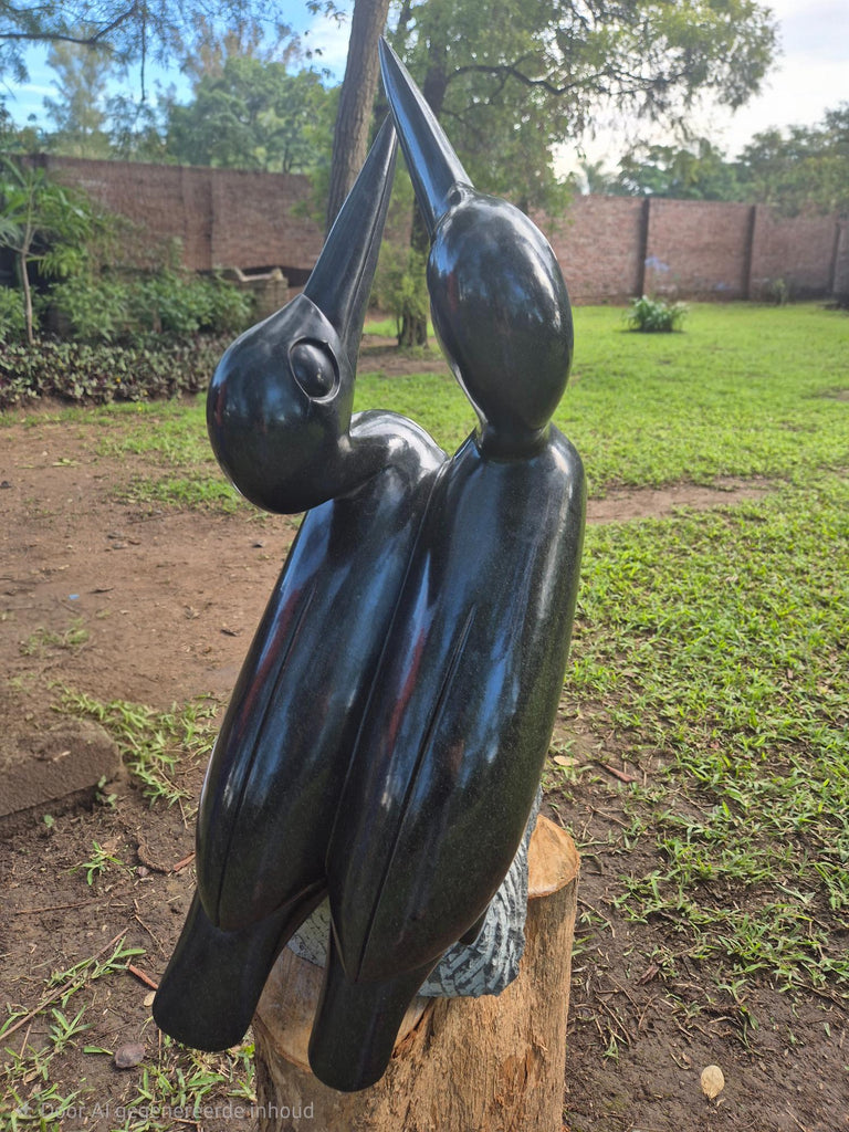 tuinbeeld grote vogels in steen, lange bek, sierlijk beeld voor huis of tuin, shona kunst zimbabwe, beeldentuin driegoten hamme